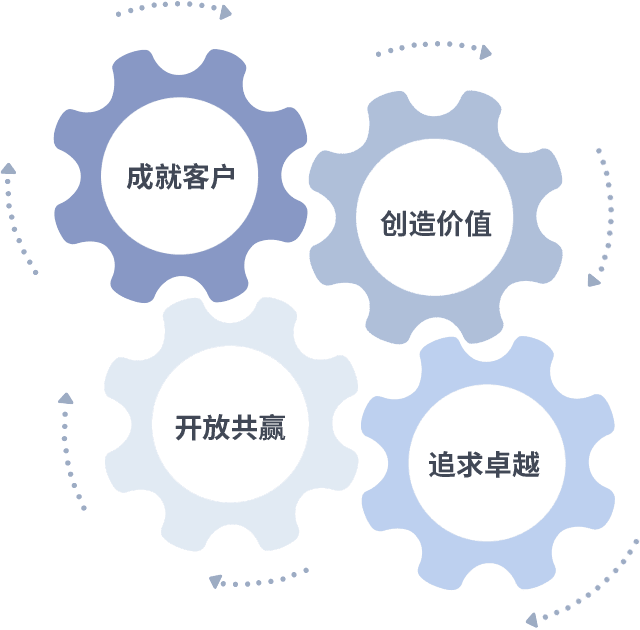 成就客户是一切决策的出发点,,,创造价值是衡量所有工作的标准,,追求卓越是我们做事做人的态度,,,,开放共赢是我们的格局也是最终的结果。。价值观的齿轮环环相扣,,推动着组织里的每个人不断向前。。
