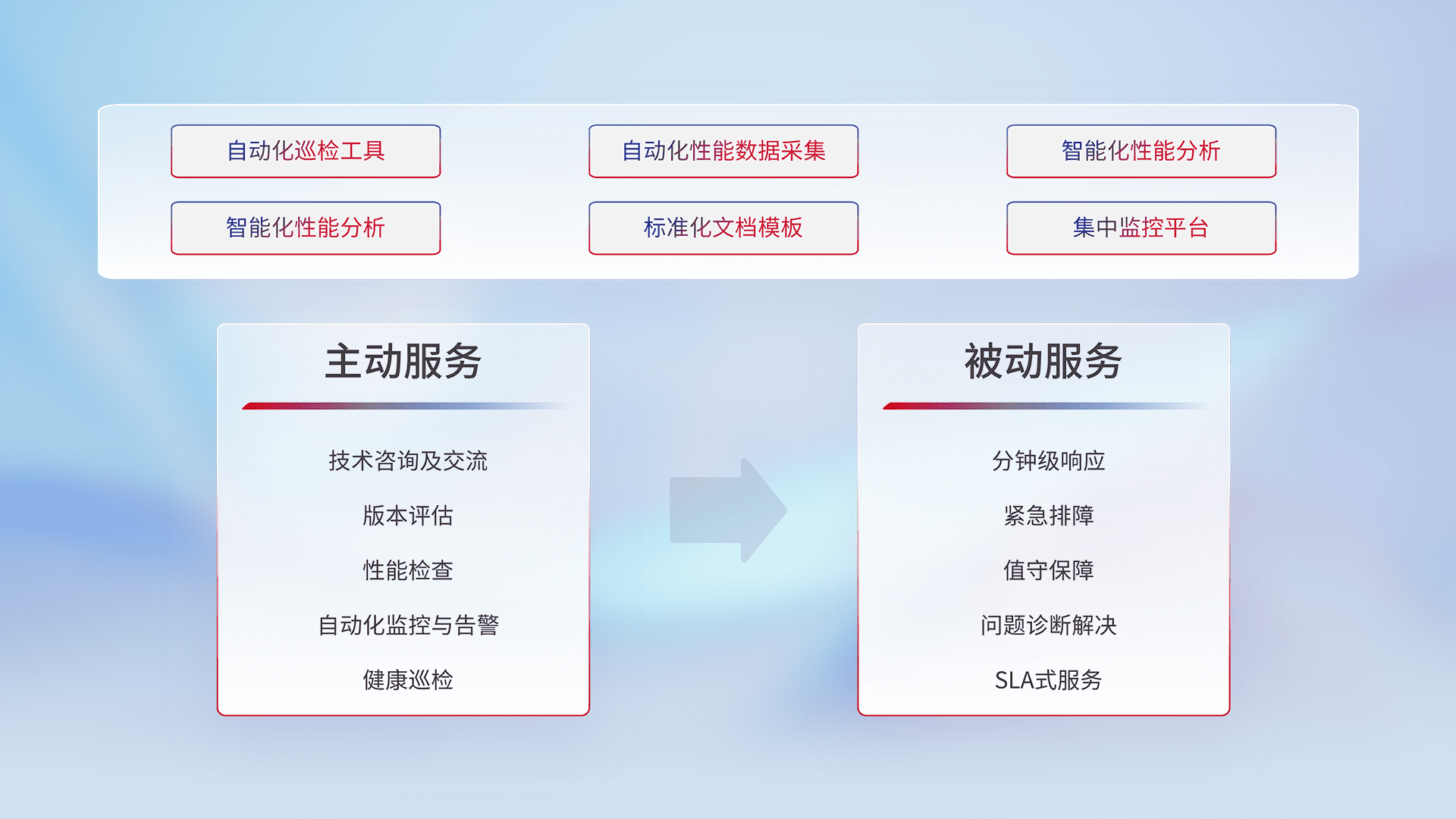 智能化工具和标准化文档,,,,保障服务质量,,,提供主动服务(包含技术咨询、、版本评估、、、、性能检查、、、自动化监控与告警、、、、健康巡检)和被动服务包含(分钟级响应、、、、紧急排障、、、、值守保障、、、、问题诊断解决、、、、SLA服务)。。