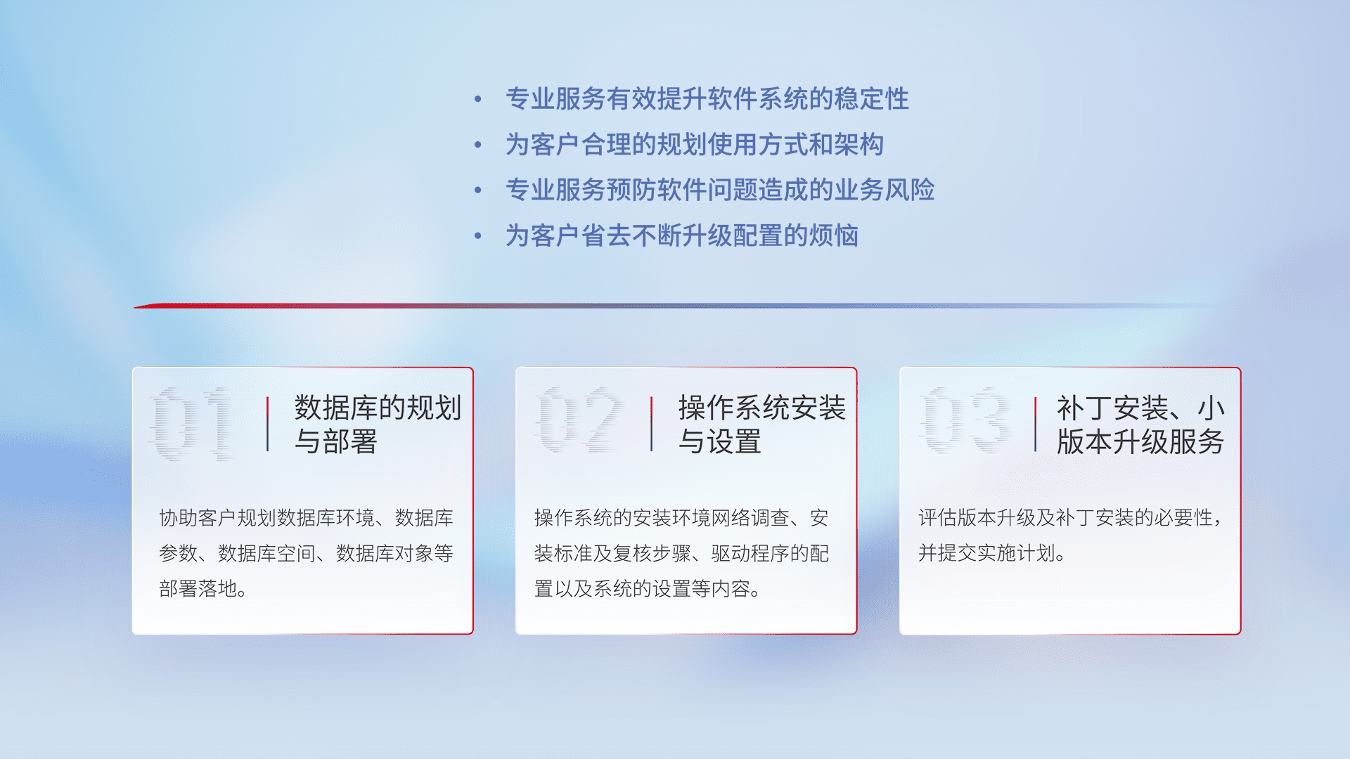 为客户提供软件规模升级、、、、快速部署、、、按需配置的专业服务,,从数据库的规划与部署到操作系统的安装与设置,,再到补丁安装和小版本升级提供支持。。。